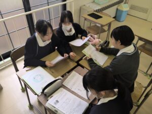 次に、砂糖は良いものなのかを考えました。2015年3月5日の日本経済新聞の記事によると、世界保健機構(WHO)は肥満や虫歯を予防するために、砂糖などの糖類を一日に摂取するカロリーの5%未満に抑えるべきだとする新指針を発表したとのことです。健康志向の高まりが糖質摂取量抑制の追い風にもなっているようです。新聞の難しい記事でしたが、生徒たちは難しい語句や文章の成り立ちを細かく調べたり考えたりしながら、砂糖と健康に関して考えました。